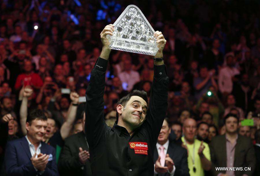 Ronnie O'Sullivan of England celebrates with the trophy after the final match with Joe Perry of England at Snooker Masters 2017 at the Alexandra Palace in London, Britain on Jan. 22, 2017. Ronnie O'Sullivan claimed the title by winning 10-7. (Xinhua/Han Yan)