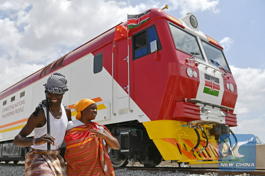 A locomotive is seen at a construction site of the Standard Gauge Railway (SGR) project, near Sultan Halmud, Kenya, on May 28, 2016. Kenyan President Uhuru Kenyatta said Saturday China-funded high speed railway which runs from the coastal city of Mombasa to Nairobi will be completed ahead of the schedule. (Xinhua/Pan Siwei)