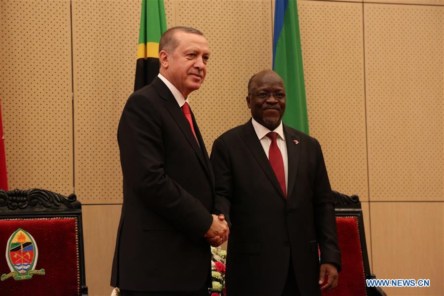 Tanzanian President John Magufuli (R) meets with his Turkish counterpart Recep Tayyip Erdogan in Dar es Salaam, Tanzania, Jan. 23, 2017. Tanzania and Turkey on Monday agreed to boost economic ties shortly after they had signed partnership agreements in education research, health, transport, defence and security. (Xinhua/Mroki)