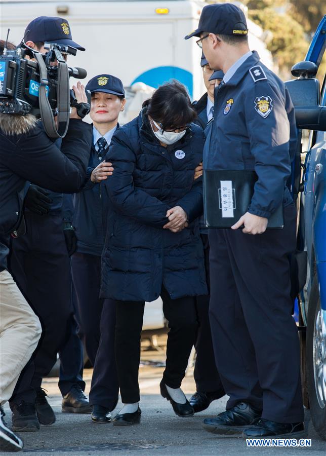 Choi Soon-sil (C), the jailed confidante of impeached South Korean President Park Geun-hye, arrives for hearing arguments at the Constitutional Court in Seoul, South Korea, Jan. 16, 2017. (Xinhua/Lee Sang-ho)