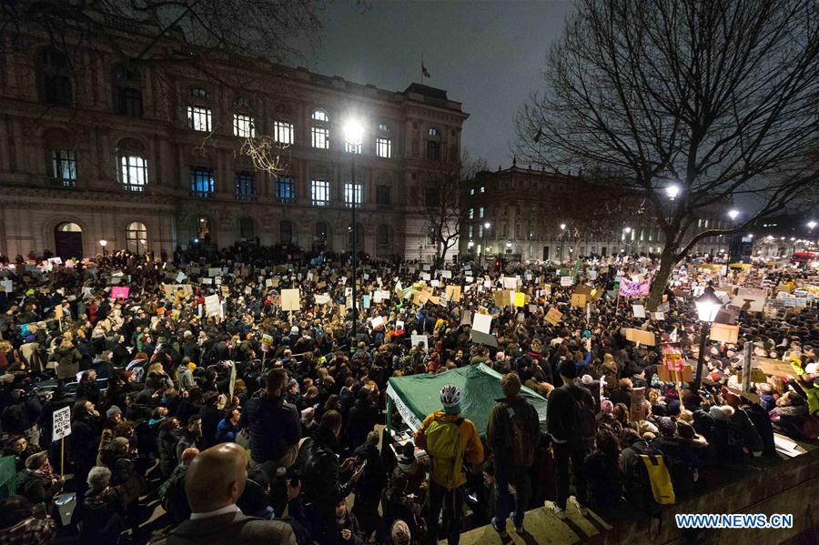 Demonstrators gather outside Downing Street in London, Britain, to protest against U.S. President Donald Trump's executive order temporarily barring all refugees and seven Mideast and North African countries' citizens from entry into the United States, on Jan. 30, 2017. (Xinhua/Ray Tang)