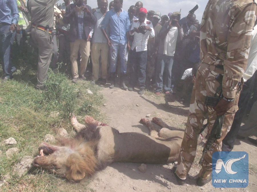 A dead lion is seen in Isinya, Kenya, on March 30, 2016. Kenya Wildlife Service (KWS) rangers on Wednesday shot dead a stray lion after it had attacked and injured a man in Isinya, Kajiado County in southeast of Nairobi. (Xinhua/Allan Mutiso)