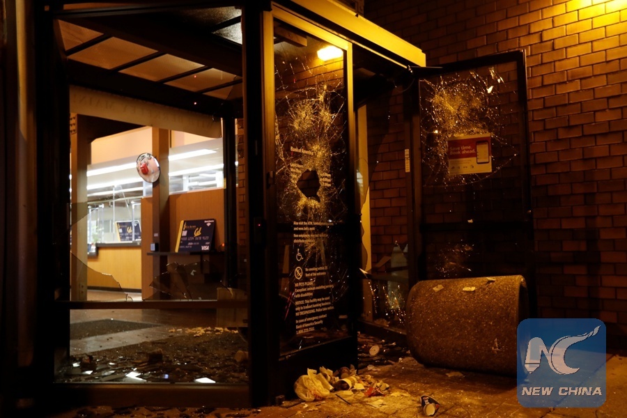 A vandalized Bank of America office is seen after a student protest turned violent at UC Berkeley during a demonstration over right-wing speaker Milo Yiannopoulos, who was forced to cancel his talk, in Berkeley, California, U.S., February 1, 2017. (Xinhua/REUTERS)