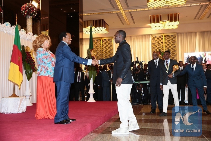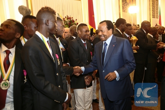 Cameroonian President Paul Biya (2nd L) shakes hands with a player of Cameroon's National Football Team, in Yaounde, Cameroon, Feb. 8, 2017. Paul Biya on Wednesday saluted the National Football Team for winning the champion of the 2017 African Cup held in Libreville, capital of Gabon. (Xinhua/Fabrice Ngon)