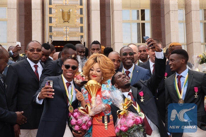 Players of Cameroon's National Football Team (C) display the trophy they won to their fans in Yaounde, Cameroon, Feb. 8, 2017. Cameroonian President Paul Biya on Wednesday saluted the National Football Team for winning the champion of the 2017 African Cup held in Libreville, capital of Gabon. (Xinhua/Fabrice Ngon)
