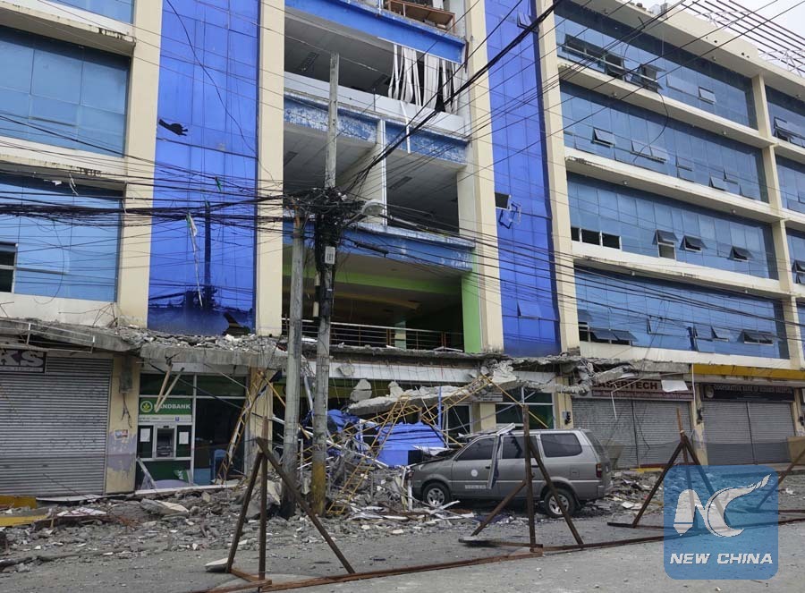Photo taken on Feb. 11, 2017 shows the scene of a damaged building after a 6.7 magnitude earthquake striking in Surigao City in Southern Philippine province of Surigao del Norte. (Xinhua/Stringer)