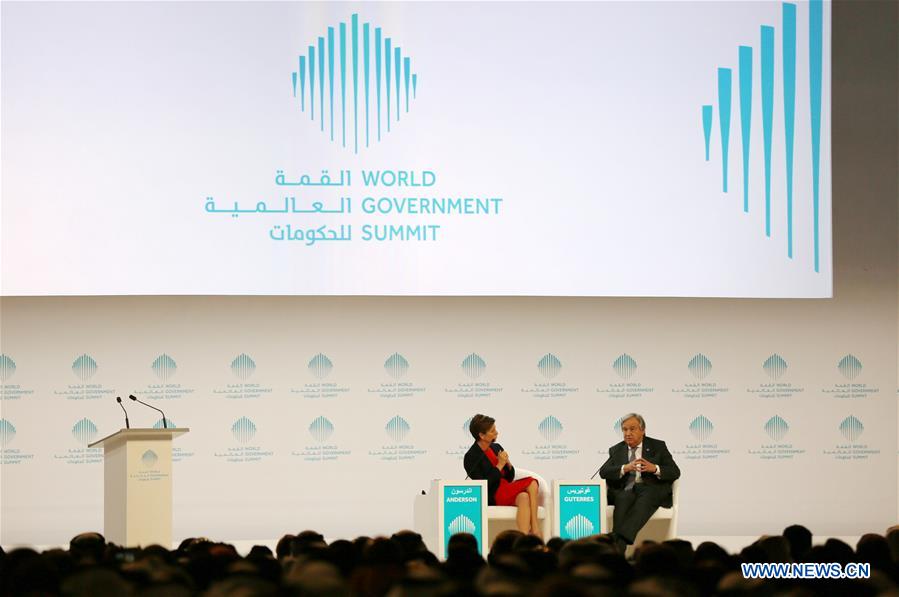 United Nations Secretary General Antonio Guterres (R) attends the 5th World Government Summit in Dubai, the United Arab Emirates, Feb. 13, 2017. Guterres said here on Monday that he was disappointed that the U.S. opposed his appointment of former Palestinian Prime Minister Salam Fayyad as UN envoy to mediate in the conflict in Libya. (Xinhua/Li Zhen)