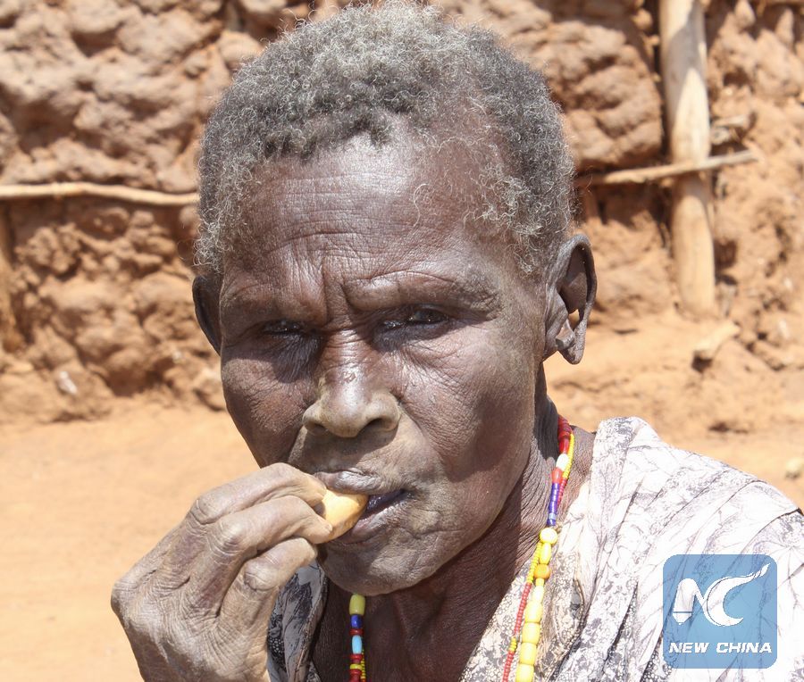File photo taken on March 12, 2015 shows an old woman is seen outside her mud-house in drought-hit Baringo, northwest Kenya. (Xinhua)