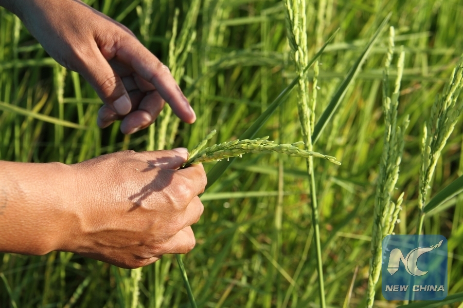File photo taken on May 5, 2016 shows an Chinese agriculture expert is checking rice plant in Kalimbeza Rice Research and Production Station in north-eastern Namibia. In April, 2015, 15 Chinese agricultural experts and technicians arrived in Namibia to conduct a two-year program of technology transfer and guidance. Tasked to help support the Southern African nation's agricultural development, they were separated into four regions to work with their Namibian counterparts in the fields of rice, gardening and husbandry. (Xinhua/Wu Changwei)