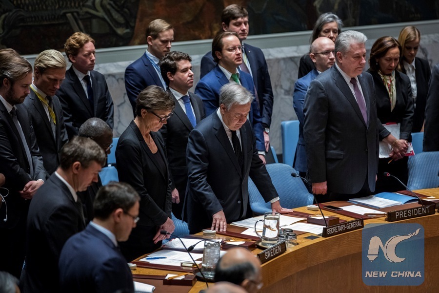 UN Secretary-General Antonio Guterres (2nd R, front) joins the UN Security Council to observe a minute of silence in memory of the late Russian UN Ambassador Vitaly Churkin at the UN headquarters in New York, on Feb. 21, 2017. The UN Security Council on Tuesday paid tribute to the late Russian UN Ambassador Vitaly Churkin, mourning the veteran diplomat with a series of condolences. (Xinhua/Li Muzi)