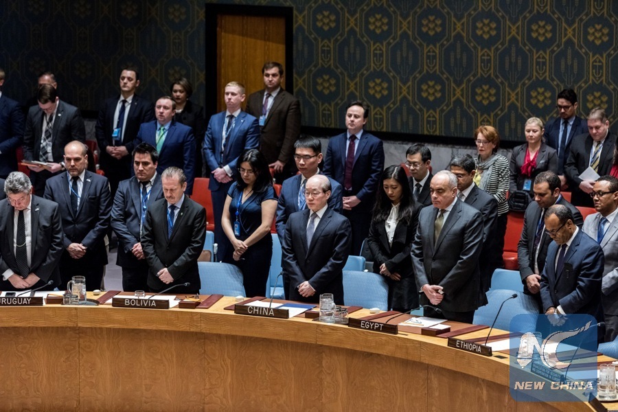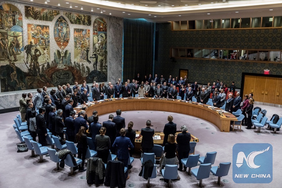 The UN Security Council observes a minute of silence in memory of the late Russian UN Ambassador Vitaly Churkin at the UN headquarters in New York, on Feb. 21, 2017. The UN Security Council on Tuesday paid tribute to the late Russian UN Ambassador Vitaly Churkin, mourning the veteran diplomat with a series of condolences. (Xinhua/Li Muzi)