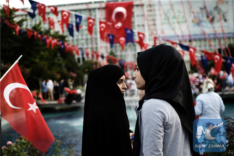This file photo taken on July 17, 2016 shows two young women in headscarves attending a pro-government demonstration outside the city hall in Istanbul. (AFP photo)