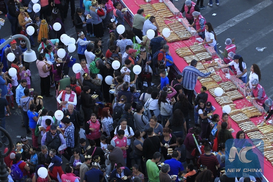 Residents line up to receive a piece of Rosca de Reyes, an oval-shaped Mexican bread, at the Zocalo Square in Mexico City, Mexico, Jan. 5, 2017. Mexicans celebrate Epiphany, also known as the Three Kings Day, a religious festival coming around Jan. 6 each year. (Xinhua/Str)