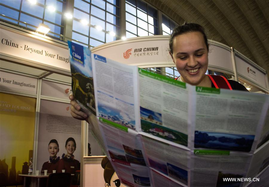 A visitor studies the brochure of China at the 39th International Tourism Fair in Belgrade, Serbia on Feb. 23, 2017. The fair took place with the slogan "Enjoy in time" from Feb. 23 to 26, with 1,100 exhibitors from 56 countries. (Xinhua/Nemanja Cabric)