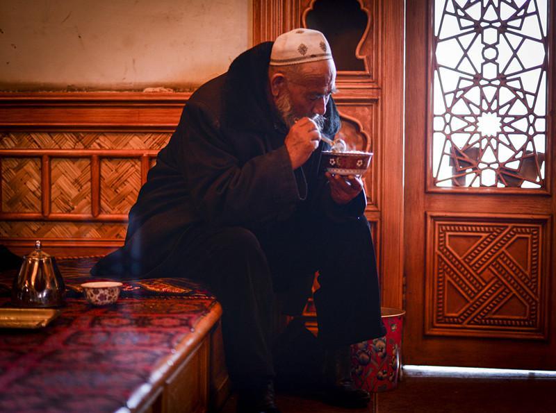 An old man enjoys tea over Naan, a kind of local crusty bread. A piece of Naan, which costs only two yuan, and a pot of tea make a common lunch in Kashgar.