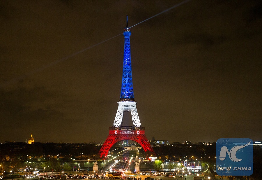 The Eiffel Tower is lit with the blue, white and red colours of the French flag in Paris, France, Nov. 16, 2015, to pay tribute to the victims of the terror attacks on Friday in the French capital. (Xinhua/Xu Jinquan)