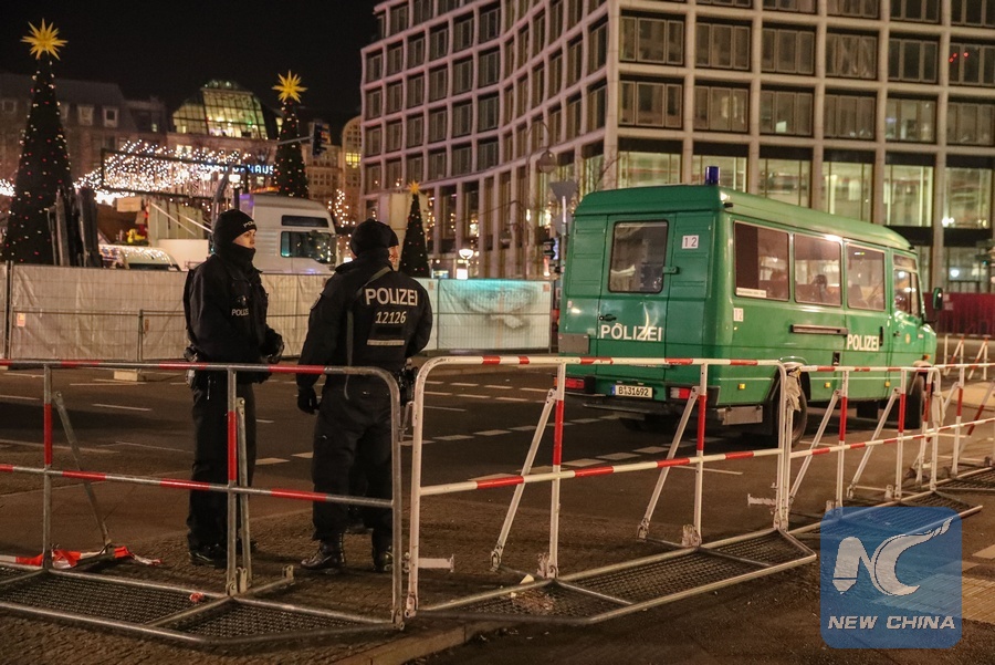 Police officers stand guard near the attacked Christmas market in Berlin, capital of Germany, on Dec. 21, 2016. (Xinhua/Shan Yuqi)