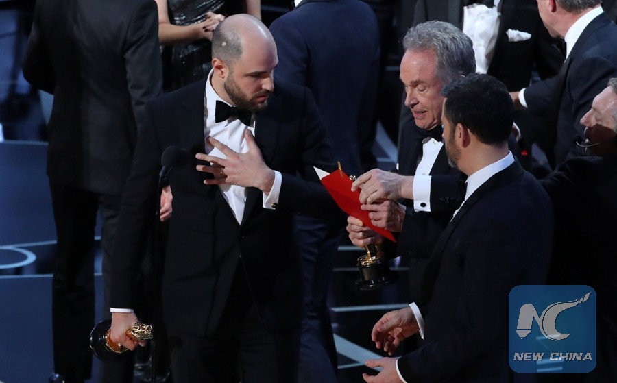 LOS ANGELES, Feb. 26 (Xinhua) -- The 89th Academy Awards "surprised" the audience Sunday night by being not so political, not so white and not so right. The ceremony was looking classy and glamorous as usual, until the Best Picture Award announcement turned into chaos.