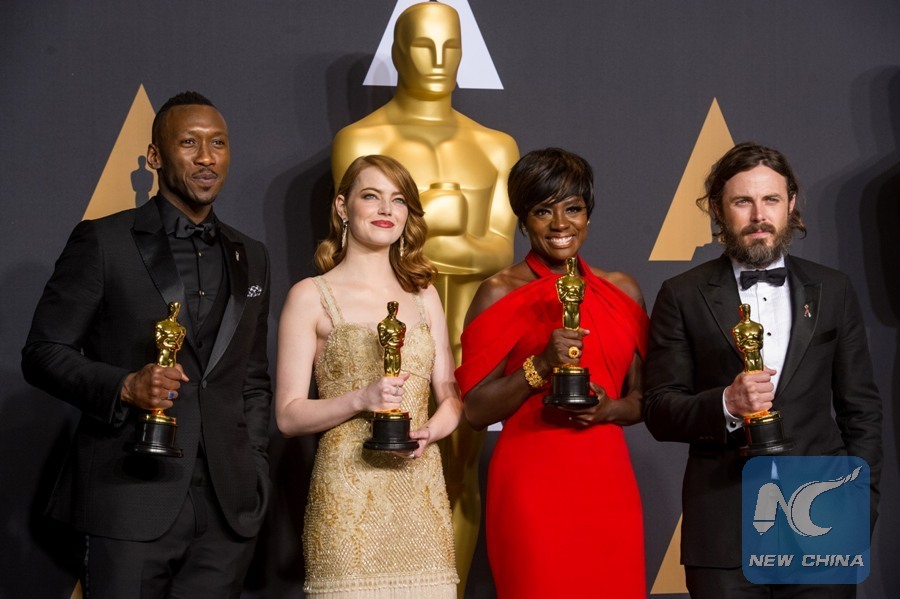 (L-R) Actor Mahershala Ali, winner of Best Supporting Actor for "Moonlight," Emma Stone, winner of Best Actress for "La La Land," Viola Davis, winner of Best Supporting Actress for "Fences," and Casey Affleck, winner of Best Actor for "Manchester by the Sea" pose for group photos at press room of the 89th Academy Awards at the Dolby Theater in Los Angeles, the United States, on Feb. 26, 2017. (Xinhua/Yang Lei)
