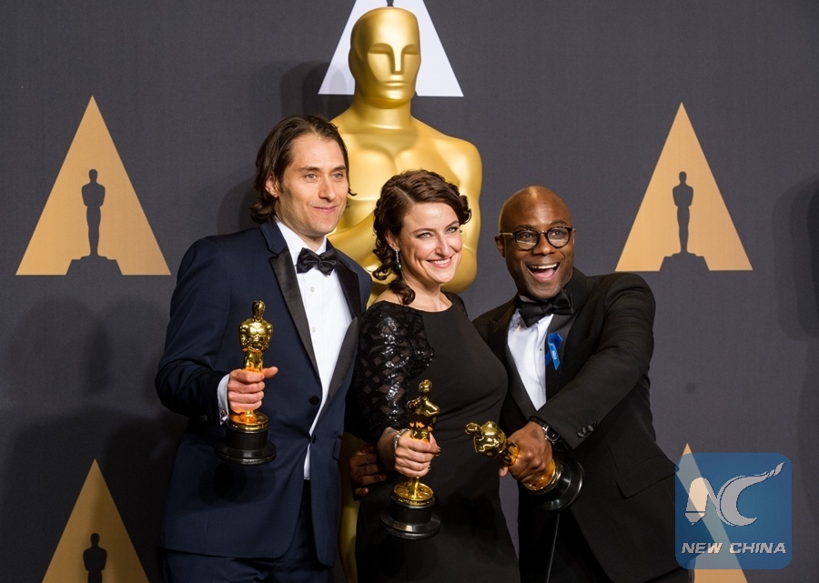 (L-R) Producers Jeremy Kleiner, Adele Romanski and director Barry Jenkins, winners of Best Picture "Moonlight", pose at press room of the 89th Academy Awards at the Dolby Theater in Los Angeles, the United States, on Feb. 26, 2017. (Xinhua/Yang Lei)