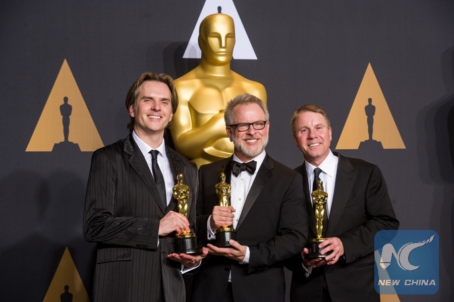 (L-R) Co-directors Byron Howard and Rich Moore and producer Clark Spencer, winners of Best Animated Feature Film "Zootopia", pose at press room of the 89th Academy Awards at the Dolby Theater in Los Angeles, the United States, on Feb. 26, 2017. (Xinhua/Yang Lei)