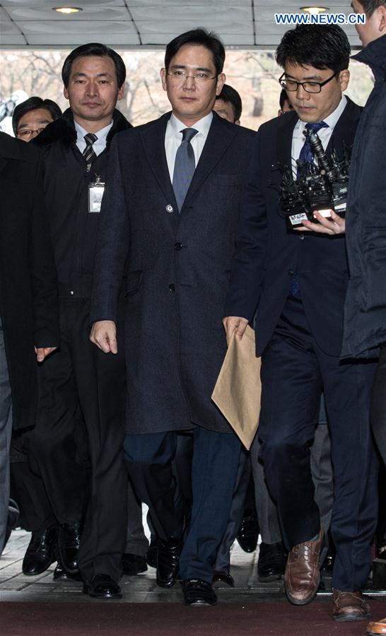 Samsung Electronics Vice Chairman Lee Jae-yong (C) enters a Seoul court for hearings in Seoul, South Korea, on Feb. 16, 2017. The heir apparent of Samsung Group, South Korea's largest family-run conglomerate, on Thursday appeared in hearings at a Seoul court, which will decide whether to issue an arrest warrant for him sought by prosecutors. (Xinhua/Lee Sang-ho)