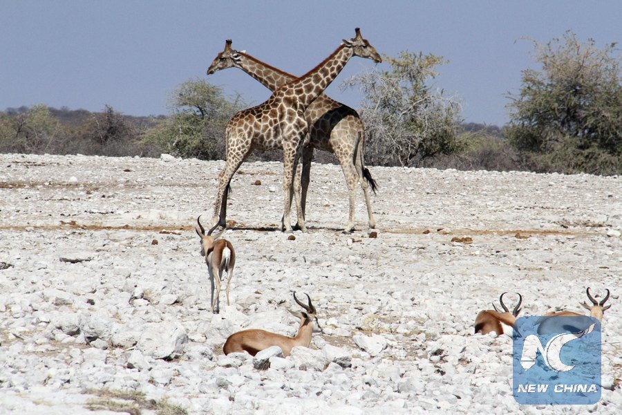 Giraffes and steenboks are seen at the Etosha National Park, northwestern Namibia, July 30, 2016. (Xinhua/Wu Changwei)