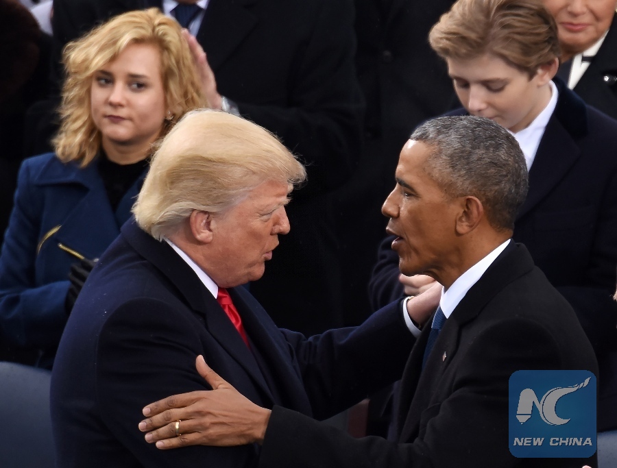File photo taken onJan. 20, 2017 showsU.S. President Donald Trump(L, front) is greeted by former U.S. President Barack Obama after delivering his inaugural address during the presidential inauguration ceremony at the U.S. Capitol in Washington D.C., the United States. (Xinhua/Yin Bogu)