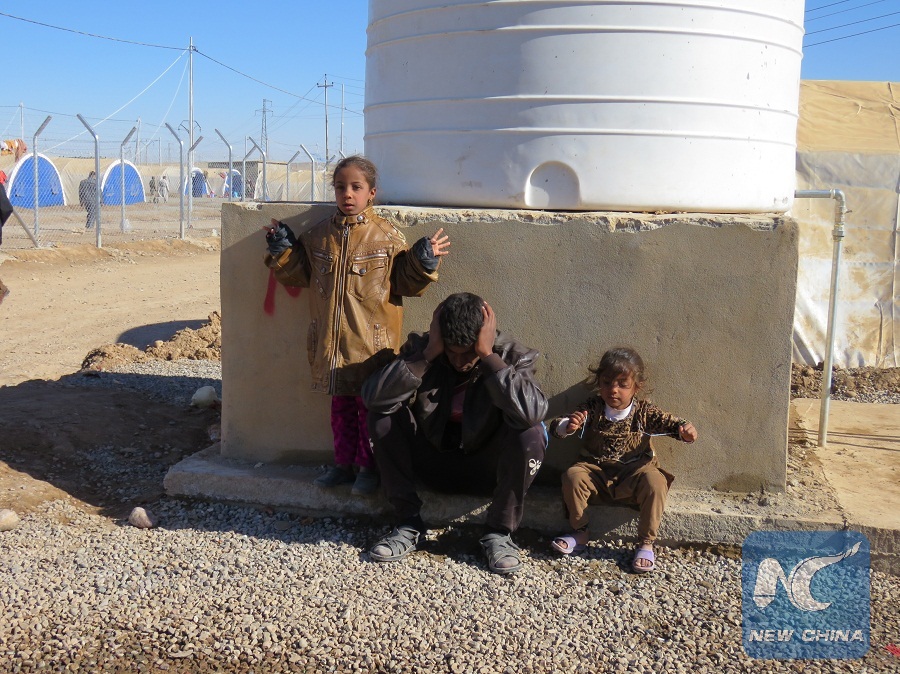 A man and his two daughters are seen in the Khazir Camp for Internal Displaced Person, about 30 km east of Mosul in northern Iraq, on Nov. 21, 2016. (Xinhua/Khalil Dawood)