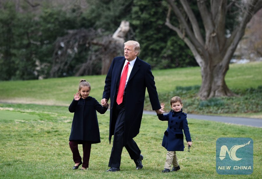 U.S. President Donald Trump walks with his grandchildren Arabella Kushner (L) and Joseph Kushner (R) to board Marine One from the White House in Washington D.C., the United States, March 3, 2017. (Xinhua/Yin Bogu)