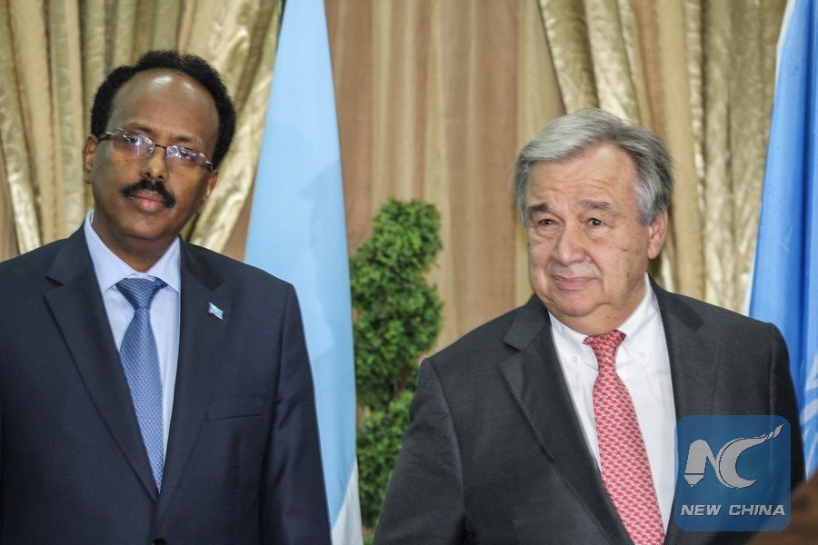 UN Secretary-General Antonio Guterres (R) and Somali President Mohamed Abdullahi Mohamed attend a press conference in Mogadishu, capital of Somalia, March 7, 2017. Guterres landed in Mogadishu Tuesday in what he described as an urgent need to address the ongoing an outbreak of cholera and severe drought ravaging the Horn of Africa nation. (Xinhua/Faisal Isse)