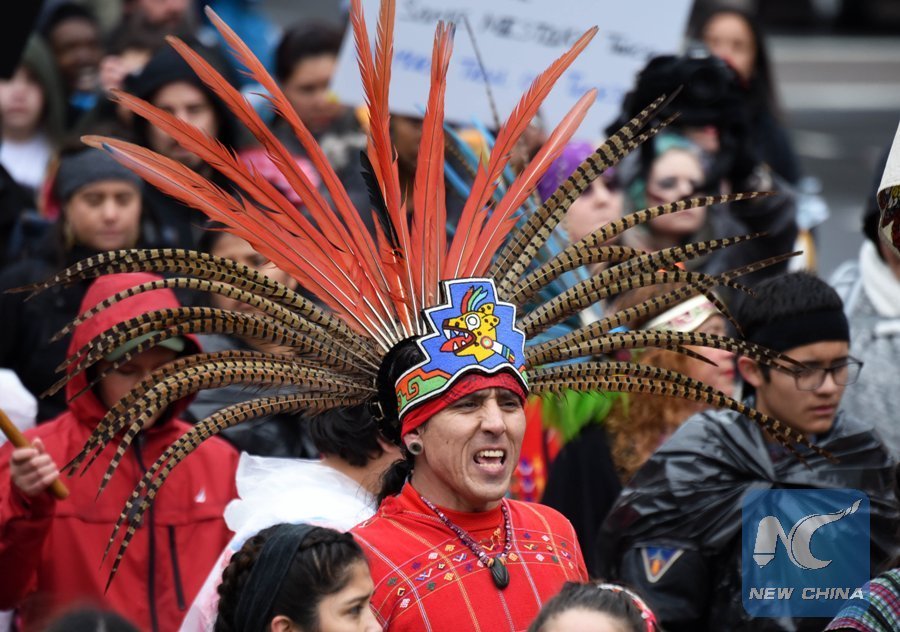 Indigenous people from numerous tribes attend a protest in Washington D.C., the United States, on March 10, 2017. (Xinhua/Yin Bogu)