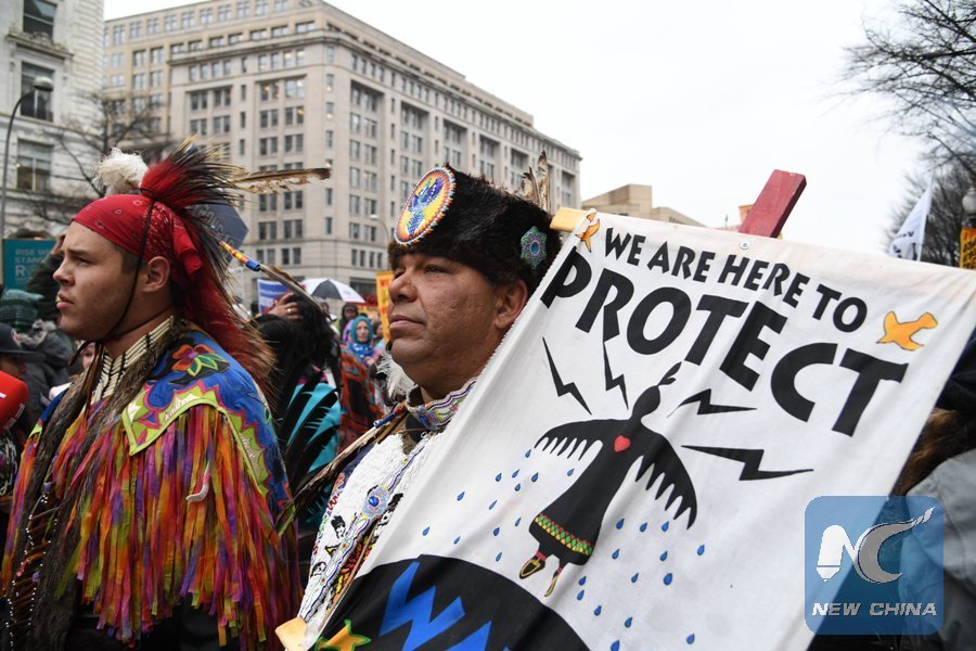 Indigenous people from numerous tribes attend a protest in Washington D.C., the United States, on March 10, 2017.(Xinhua/Yin Bogu)