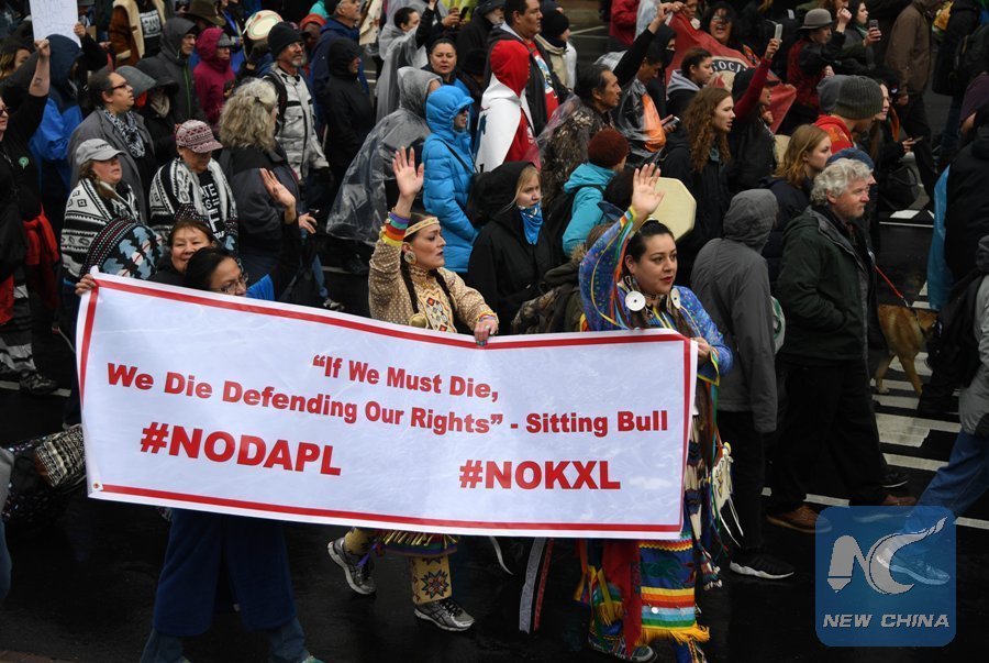 WASHINGTON, March 10 (Xinhua) -- Thousands of protesters, many of whom are Native Americans, took to the streets in Washington D.C. on Friday to oppose a pipeline project which they say may harm the environment.