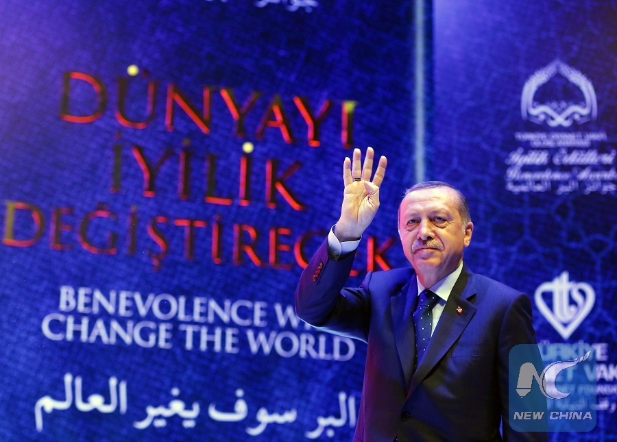 Turkish President Tayyip Erdogan greets the audience as he arrives for a ceremony in Istanbul, Turkey, March 12, 2017. (Xinhua/Reuters Photo)