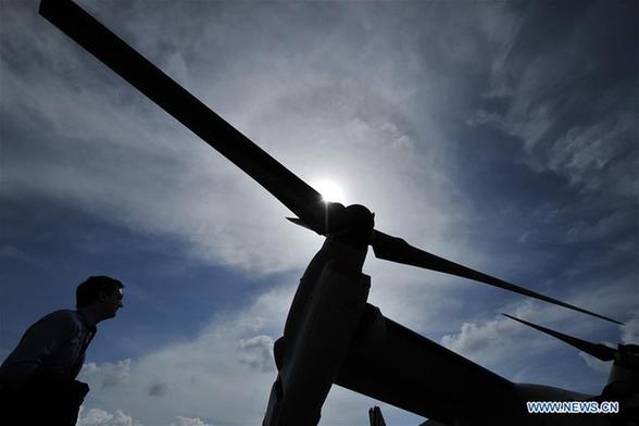 A visitor walks under one of the rotors of a V-22 Osprey tilt-rotor aircraft of the United States Air Force at the Singapore Airshow held at Singapore's Changi Exhibition Centre, Feb. 17, 2016. (Xinhuanet file photo)