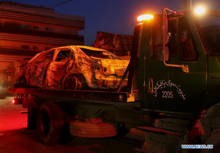 Photo taken on March 13, 2017 shows a destroyed vehicle being taken away from the site of an attack in Kabul, capital of Afghanistan. At least one person has been confirmed dead and eight others injured after a suicide bomber targeted a mini-bus in Taimany locality in Afghanistan's capital Kabul on Monday. (Xinhua/Rahmat Alizadah)