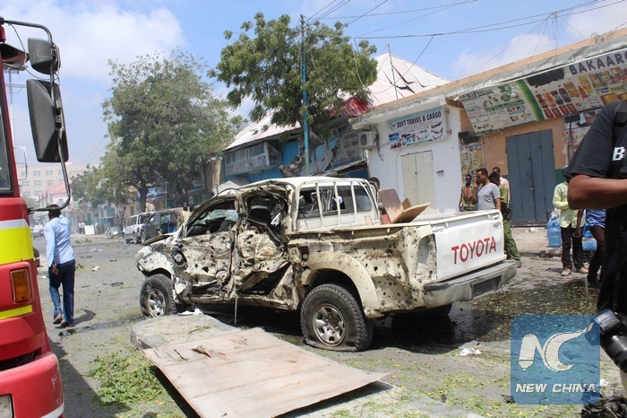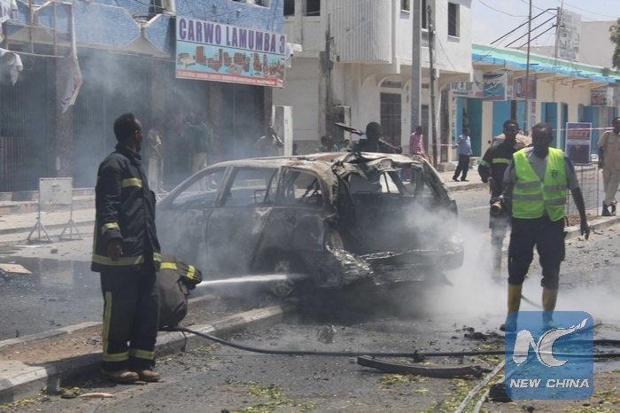 Firefighters work at the site of a suicide attack in Mogadishu, Somalia, March 13, 2017. At least two people were killed in a car bomb blast in the Mogadishu on Monday, police said. (Xinhua/Faisal Isse)