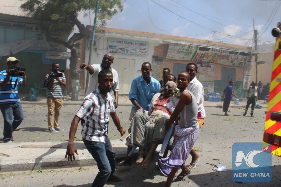 Local people carrying a wounded person leave the site of a suicide attack in Mogadishu, Somalia, March 13, 2017. At least two people were killed in a car bomb blast in the Mogadishu on Monday, police said. (Xinhua/Faisal Isse)