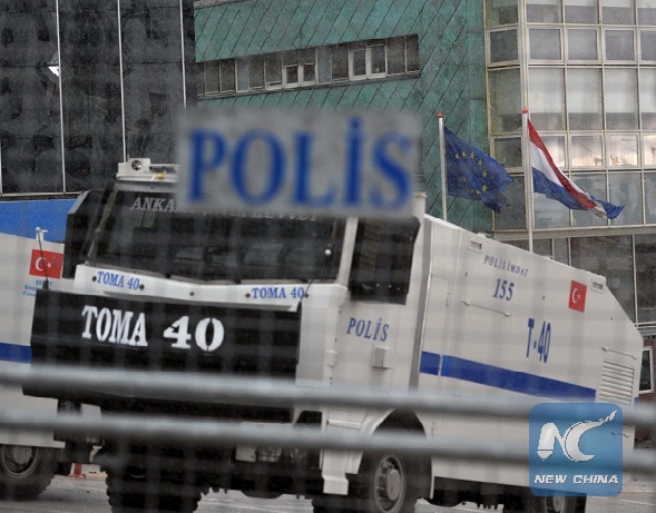 A Turkish police vehicle is seen outside Dutch Embassy in Ankara, Turkey, March 12, 2017. Some 150 to 200 people holding Turkish national flags gathered in front of Dutch Embassy in Ankara on March 11 to protest Dutch bans on Turkish politicians from holding rallies in Netherlands ahead of April 16 constitutional referendum. (Xinhua/Mustafa Kaya)