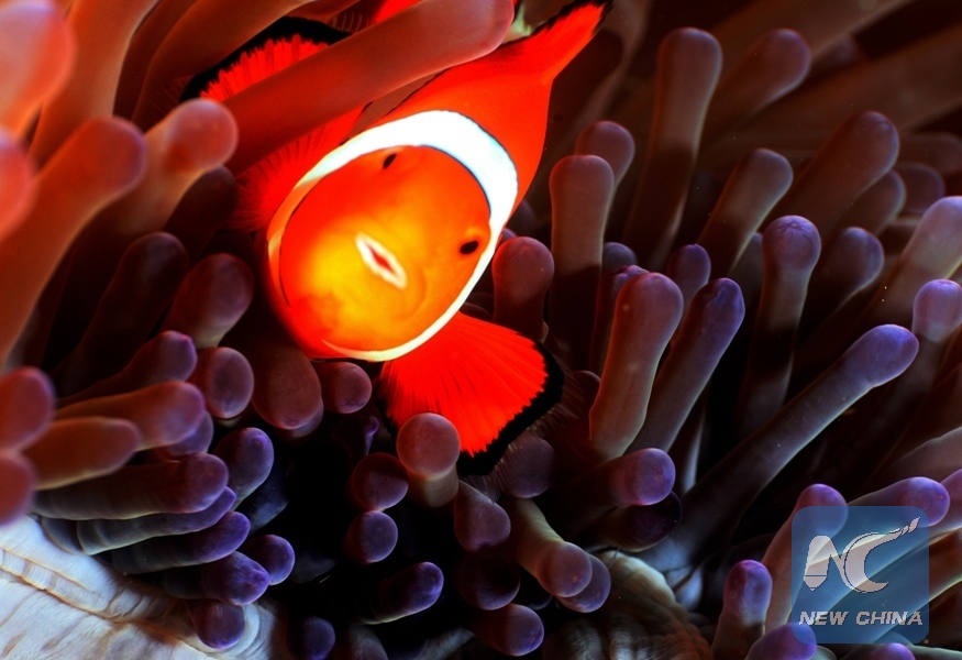 An anemone fish swims near sea anemones living on the coral reefs in the sea at Raja Ampat Islands, Indonesia, Nov. 26, 2012. (Xinhua/Jiang Fan)