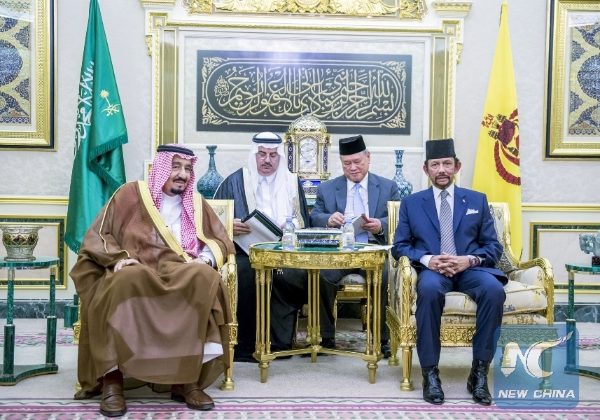 Brunei's Sultan Haji Hassanal Bolkiah (1st R) meets with visiting Saudi King Salman bin Abdul Aziz al Saud (1st L) at the Istana Nurul Iman palace in Bandar Seri Begawan, Brunei, March 4, 2017. (Xinhua/Jeffrey Wong)