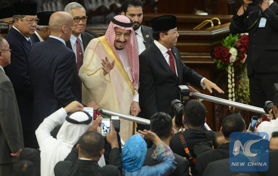 Saudi King Salman bin Abdul Aziz al Saud (C) waves to parliament members during his visit to the Indonesian parliament in Jakarta March 2, 2017. (Xinhua/Agung Kuncahya B.)