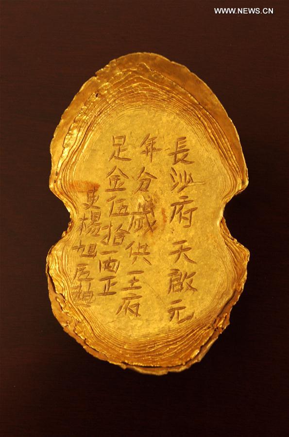 Photo taken on March 17, 2017 shows a golden ingot unearthed at Pengshan District in Meishan City, southwest China's Sichuan Province. More than 10,000 gold and silver items that sank to the bottom of a river in Sichuan Province over 300 years ago have been recovered, archeologists said Monday. The items included a large amount of gold, silver and bronze coins and jewelry as well as iron weapons such as swords, knifes and spears. (Xinhua/Chen Xie)