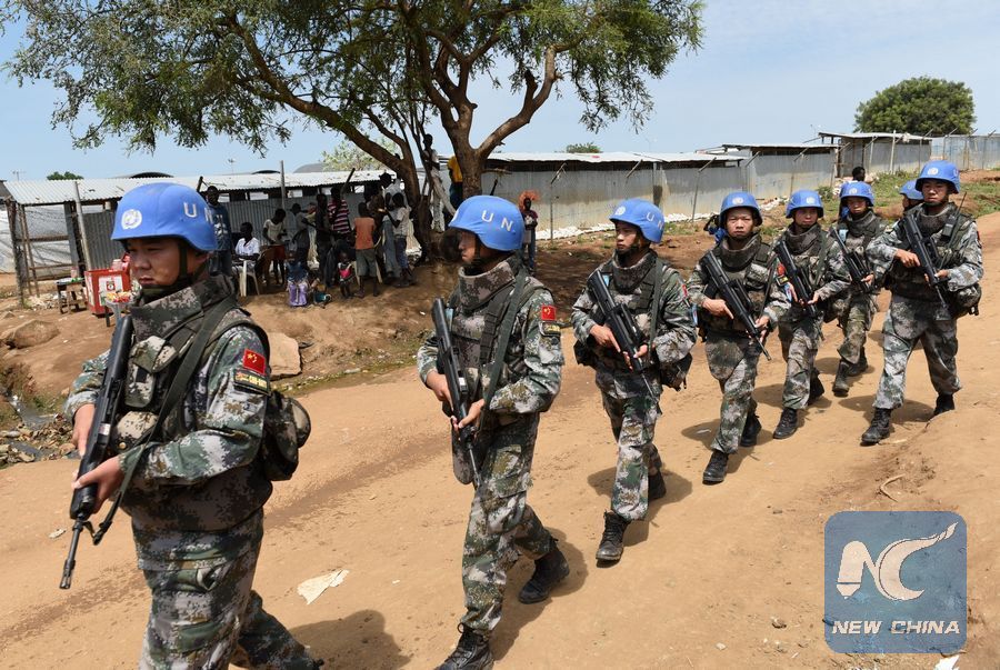 File photo shows Chinese peacekeepers patrol at the Protection of Civilians site 1 beside the United Nations House in Juba, capital of South Sudan, Aug. 11, 2016. (Xinhua/Li Baishun)