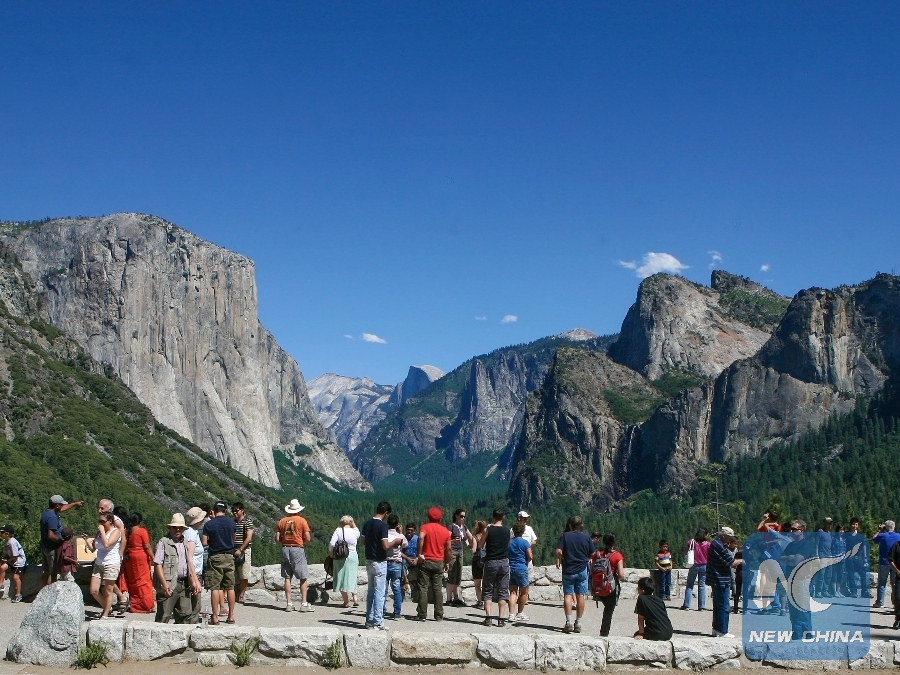 Tourists visit the Tunnel View with the granite monoliths as a backdrop in Yosemite National Park, the United States, Sept. 5, 2011. Yosemite National Park, one of the first wilderness parks in the United States, is best known for its waterfalls, but within its nearly 1,200 square miles of area in the Western Sierra Nevada Mountain range, you can find deep valleys, grand meadows, ancient giant sequoias and a vast wilderness area. The park is one of the most popular places that people visit in the United States. (Xinhua/Zhao Hanrong)