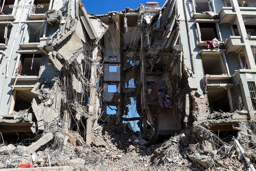Photo taken on March 26, 2017 shows the explosion site at Xiangyang residential community in Baotou City, north China's Inner Mongolia Autonomous Region. Rescuers combing the rubble of a half-collapsed apartment building in Tumd Right Banner of Baotou found two more bodies as they wrapped up the search, bringing the death toll of Saturday's explosion to five. The building in Xiangyang residential community was ripped through by an explosion early Saturday afternoon. On Saturday, the government said 25 people were injured, including four in critical condition, and 83 homes were damaged. (Xinhua/Lian Zhen)