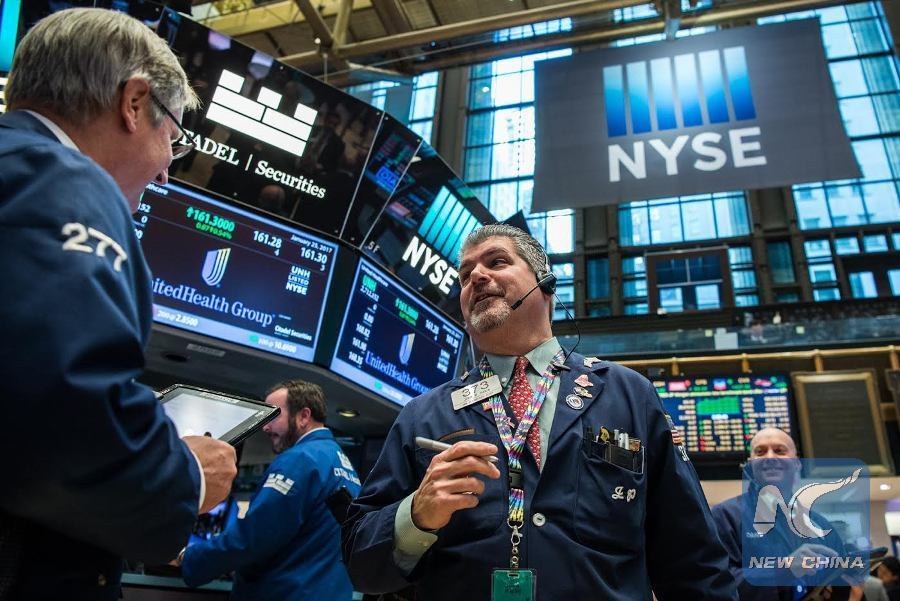 Traders work at the trading floor of the U.S. New York Stock Exchange on Jan. 25, 2017. The Dow Jones Industrial Average on Wednesday closes above the psychological mark of 20,000 points for the first time ever, while the other two major indices also finished at record highs, boosted by a batch of generally positive earnings reports. (XINHUA/Li Rui)
