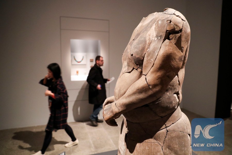 Visitors walk past by an earthenware named "Strongman" during a media preview of the Exhibition of Civilization of the Qin and Han Dynasties (221 B.C.-220 A.D.) in The Metropolitan Museum of Art, New York, the United States. (Xinhua/Wang Ying)