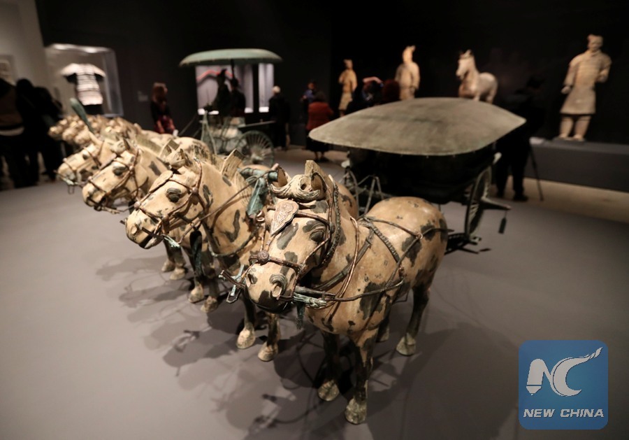 Photo taken on March 27, 2017 shows a modern replica of bronze Chariot Model during a media preview of the Exhibition of Civilization of the Qin and Han Dynasties (221 B.C.-220 A.D.) in The Metropolitan Museum of Art, New York, the United States.(Xinhua/Wang Ying)
